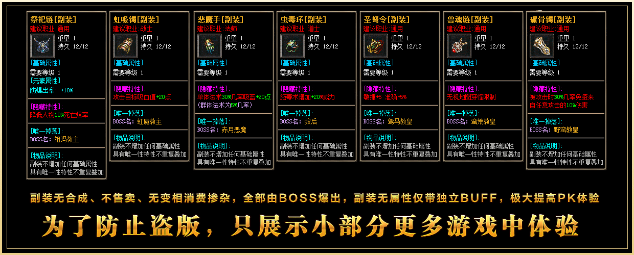 [温馨提示]:以上装备出处指的是达到多少血量的怪物会爆出,本服副装装备每个BOSS都有携带,副装无属性,自由搭配,但带有特性BUFF旨在提高游戏PK乐趣,具体游戏中体验....